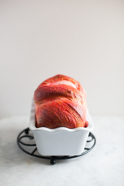 Here is the loaf baked in a regular loaf pan. You can see that the crust is pale and dull looking in comparison. It was still as tasty, but without the trapped steam the loaf just wasn’t as appealing. You’d have to add steam to the oven if you were to bake it in this style pan.