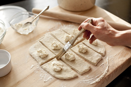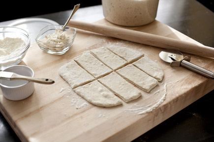 Roll out the dough to about 1/4-inch thick rectangle. Cut the rectangle into 16 equal portions. (I used 1/2-pound piece for these photos, so your rectangle will be larger.)