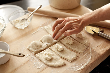 Mix together the ricotta, nutmeg, oregano, salt and pepper. Put about a tablespoon of the filling onto the dough, placing it so that you can easily close the dough around it. Brush the edge of the dough with water.