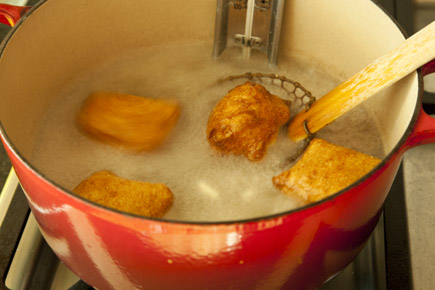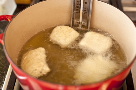 Jacki: most important thing is to use the thermometer and get the temp steady, too hot and they over-brown while center’s doughy. Too cool and they absorb tons of oil. Other tips in the books…