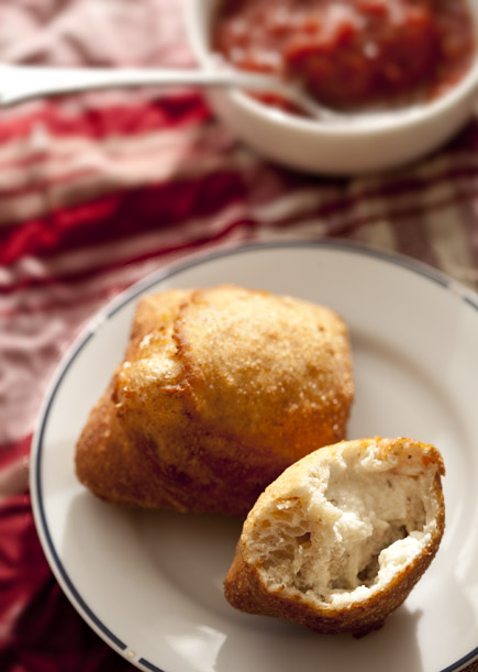 This week is Chanukah and it is all about frying our food, which brings me great joy. I am constantly trying to come up with something new to add to our menu of latkes, jelly doughnuts and all the other traditional fare. These savory doughnuts were inspired by the fried pizzas I had in Naples. We ate them as snacks during the day, to tide us over to the next pizza. Most of the pizzarias sold them outside their front doors to people waiting in long lines or folks on the run. Pizza dough stuffed with ricotta and deep friend; simple, but perfect. My boys love them stuffed with a variety of fillings, so use your imagination and create your own savory doughnuts.