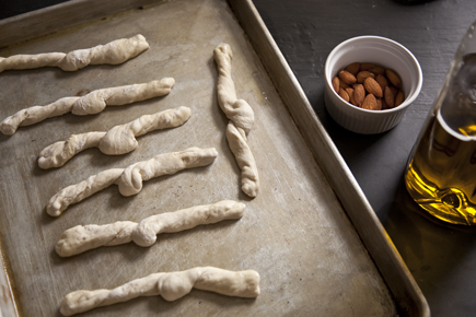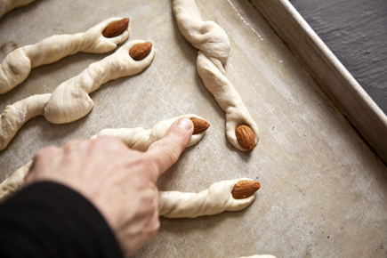 Right before baking, press the almond in the end of the breadstick.