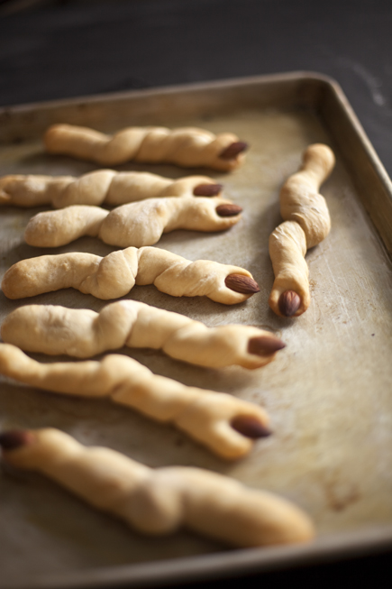 This week is the one time a year when we purposefully make our food look creepy. Halloween is great fun for the kids, but we adults love to play with our food too, and its great fun to watch people squirm just a bit. Even though these breadsticks are ghoulish, they are crunchy and delicious as well. Stick a few in the lunch box to give your kids a little Halloween thrill at school.