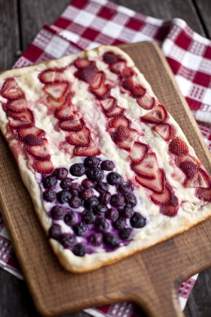 There is nothing more American than grilling on the 4th of July, well, maybe a star spangled pizza is the most patriotic of all. This is a super fast pizza that is ideal for breakfast, which I just served my family this morning, or can be throw together at your holiday BBQ as dessert. I made the pizza in a small baking sheet, but you can make a larger one if you have a crowd to feed.
