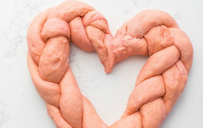 The older I get, the less I am ‘into’ Valentine’s Day, but I have two little kids who still think it is an amazing holiday, so anything red, pink, and heart-shaped is welcomed into our home on February 14. I was scrolling through Instagram last week and came across this lovely heart-shaped challah, and then, remembering Zoe’s pink swirled bread and pink braid, I thought I could combine the two together for some celebration bread. I’m happy to report that it worked! The heart braid bread turned out pretty, and tasted delicious, too.