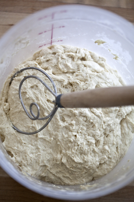 Recently we have seen lots of new readers on the website who are asking wonderful questions about how to perfect their loaves. First I’d like to say welcome to the site and thank you for trying the bread. As I bake through the basic Master recipe from ABin5 I will try to answer some of the mostfrequently asked questionsand also introduce you to a few new pieces of equipment I’ve recently started to use that make the whole experience just a little easier. The goal is to create a large batch of dough that stores in the refrigerator for up to two weeks. That’s why our method saves you so much time– all the mixing and prep is divided over four one-pound loaves.
