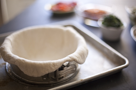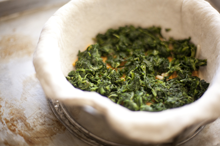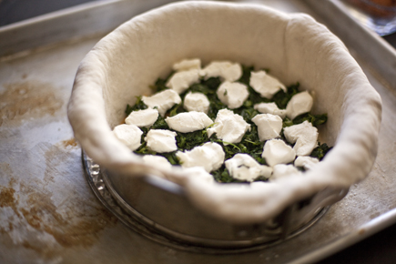 Start with a thin layer of the cheese. I then added some spinach, which a squeezed all the liquid out of.