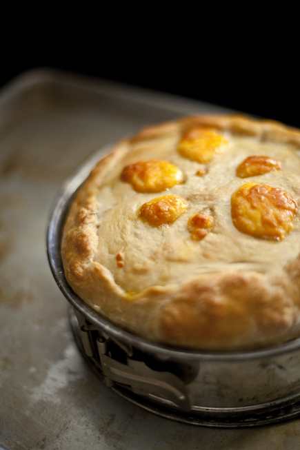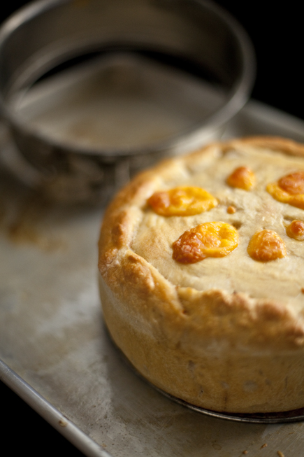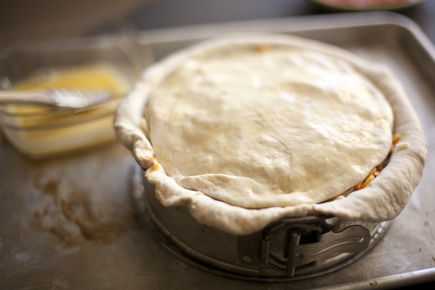 Roll out the remaining 4 ounce piece of dough and drape it over the fillings. Brush the top with egg wash.