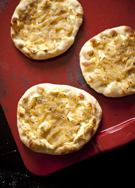 The concept for these little pizza/tarts came from a family recipe. My cousin, Riad Nasr, is a world class chef and quite often the source of inspiration in my kitchen. He practices his craft in New York City at a line-up of crazy-popular restaurants including Pastis, Minetta Tavern and Balthazar. Several years ago he wrote the Balthazar cookbook and included a savory tart with herby caramelized onions and goat cheese. I made it and fell in love. When Jeff and I decided to write our Pizza book I knew this flavor combo would be fantastic as a pizza. I’ve made it in several classes that we’ve taught to rave reviews, so I thought I would make it with you here.