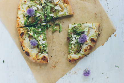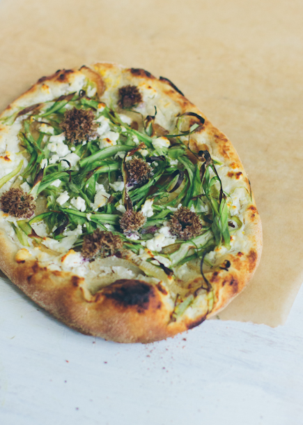 The asparagus season is short, and since we’re on the very tail end of it, working it into a flatbread seemed like a good idea. Technically this might just as easily be a pizza, since there is sauce, some cheese, and a heaping of vegetables. Either way, it’s a delicious dinner. The caramelized onion spread is sweet, and adds a nice backdrop of flavor. The asparagus is peeled into ribbons, and this technique helps them bake easily, leaving a tender bite and a subtle flavor. Goat cheese lends just a bit of tang, and if you happen to have chives growing in your garden, topping it all off with chive flowers makes a beautiful presentation.