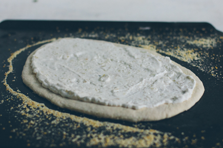 I made this last night and the carmelized onion spread made with sour cream is wonderful! I have often made pizzas with goat cheese and found them too dry. I added some buttermilk and sour cream to the carmelized onions, whizzed them in my speedy Bullet blender and spread them on the dough, added asparagus and some chive flowers which I have in my yard, and the resulting baked pizza was amazing! Very tasty and different. Excellent!