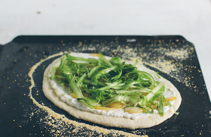 Our olive oil dough is a bit richer than the master recipe, and this also adds some good flavor to the flatbread (and, is also delicious in focaccia bread as well). ‘Shaving’ the asparagus take a bit of time, but the end results are worth it: there is no worry of biting into an undercooked piece of asparagus. Also, this should work well on the grill, if you’d like to move things outside (I use a Weber grill).