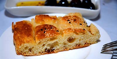 New York’s a great bread town; its best bakeries are really world class. But if you start sampling restaurants not neccesarily known for their bread, it gets kind of variable. It’s a real disappointment to sit down to a week of great restaurant meals in one of the world’s great food cities, and find that only one of them is accompanied by good bread (pictured above; a Turkish pita with black and white sesame seeds at Zeytin Turkish Restaurant and Bar, on the Upper West Side). Zeytin’s pita, done by a bakery service, has been a bread high point of a nine-day stay in the Big Apple.