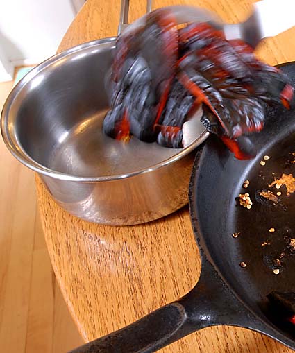 Thanks for being patient with my roasted red pepper obsession.  Above, dropping the scorched peppers into a bowl to steam (see last week’s post on roasting your own peppers).  But now the embarrassing part:  I shot the video on a different day from pepper-roasting time, so I stuffed the fougasse with with tomato and cheese.  So it’s really fougasse in the pizza margherita style.  But you get the picture, or at least, the video: