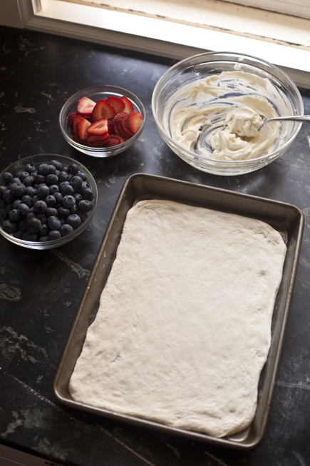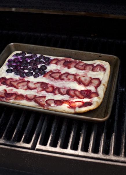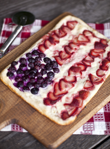 There is nothing more American than grilling on the 4th of July, well, maybe a star spangled pizza is the most patriotic of all. This is a super fast pizza that is ideal for breakfast, which I just served my family this morning, or can be throw together at your holiday BBQ as dessert. I made the pizza in a small baking sheet, but you can make a larger one if you have a crowd to feed.