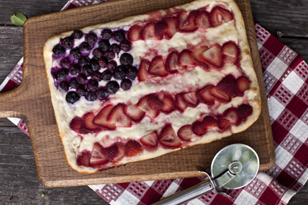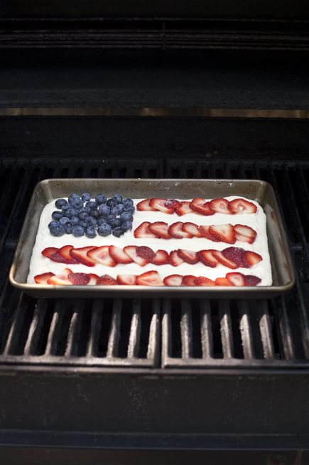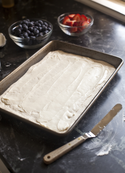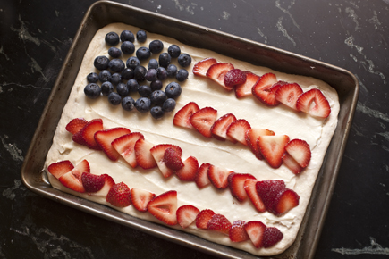 Arrange the berries over the topping in a flag pattern. Sprinkle the remaining sugar over the top of the berries.