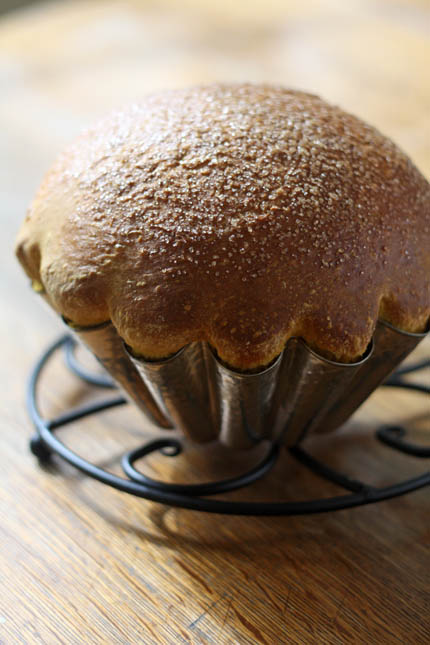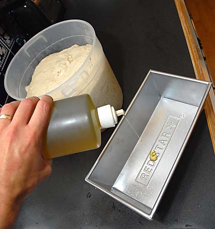 In the books, I’ve tended to be on the careful side about loaf pans. Since this dough is so wet, I recommended non-stick pans and even so, to grease them well. Yet a very heavyweight aluminum pan works beautifully too– all you have to do is grease it well (I like olive oil even for American-style breads but you can use any liquid or solid shortening you like):