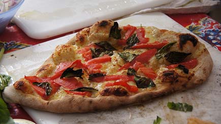 Add toppings to your pizza (I kept mine simple: sauce and cheese, with a scattering of basil leaves after the pizza emerged from the oven). Slide the pizza onto the preheated stone. Check for doneness in 8 to 10 minutes, and turn the pizza around in the oven if one side is browning faster than the other. I took my pizza out earlier for a lighter crust (my kids’ preference), but you can take your crust as dark as you like.