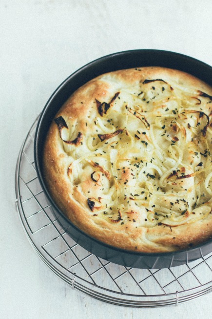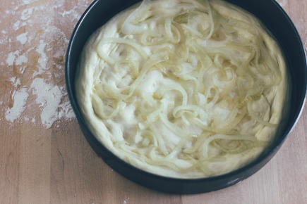 Make a focaccia as described, then pile on caramelised onions (up to half a centimetre deep – not sure what that would be in inches – a quarter of an inch maybe?) topped with black olives and anchovies in oil (drained). Leave to rise for 20 mins or so, then put in the oven at a slightly lower temperature than you give due to the amount of onion topping.