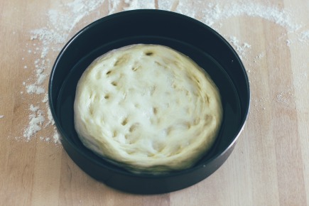 Using your hands, flatten it into a 1/2 inch thick round. Place the dough top side down into the cake pan, and move it around a bit to cover it in olive oil. Turn the dough over, cover the pan with plastic wrap, and let it rest for 10-15 minutes.