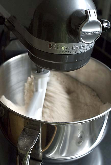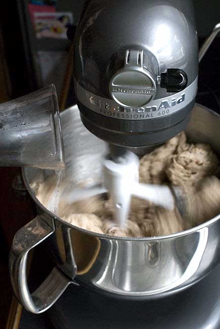 Turn the mixer on and off if continuous mixing throws flour overboard–I find that the dough hook actually works better in this size mixer but if you have the smaller capacity machine, you may prefer the flat beater. Now gradually add the 3 cups of lukewarm water and mix per your mixer’s instructions (different brands are different):