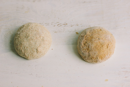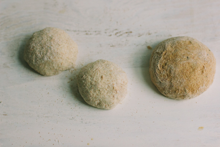 2. Dust the surface of the rye dough with flour and cut off an orange-size piece. Dust the piece with more flour and quickly shape it into a ball by stretching the surface of the dough around to the bottom on all four sides, rotating the ball a quarter-turn as you go. Cut the ball in half and form 2 balls.