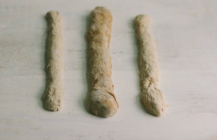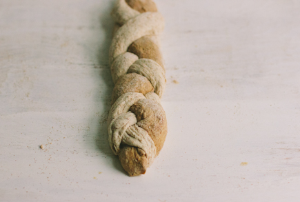 4. Line up the 3 ropes, keeping the pumpernickel rope in the center. Braid the ropes, starting from the center and working to one end. If you’ve never done a 3-stranded braid before, it’s simple—just remember to drape one of the outside strands over the center one, then do the same with the other outside strand. Repeat till you reach the end and then pinch the strands together. Flip the loaf over, rotate it, braid from the center out to the remaining end, and pinch the ends of the strands together. This seems to produce a loaf with a more uniform thickness than when braided from end to end (though if you like, just braid from end to end).