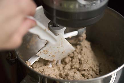 You’ll need two doughs for this recipe, rye and pumpernickel, from our first book, where we had people mix the yeast and salt into the water first, then add the flours. But you can start with the flours, and whisk in the yeast and salt before adding wet ingredients; it doesn’t really much matter unless you’re using vital wheat gluten (in which case, you have to mix the dry ingredients together first to prevent clumping). Either way, it’s a snap to mix in the KitchenAid, use the dough hook attachment for the larger machines, and the paddle attachment for the smaller ones (note that KitchenAid calls the paddle a “flat beater”):