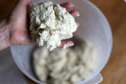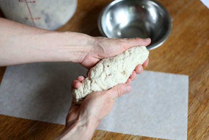 Once the dough is well chilled reach into the bucket with wet hands and pull out 1/4 of the dough.