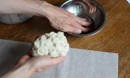 Dip your hands in more water to prevent the dough from sticking to your hands as you work.