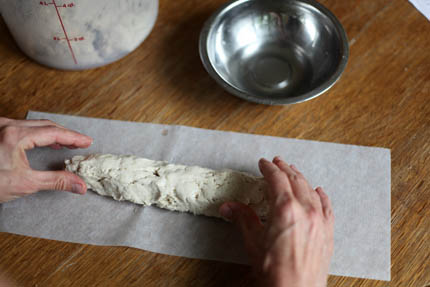 You want to press, squeeze and gently pull the dough into the shape of a baguette. This dough has no stretch to it, so you can’t pull it too hard or it will rip apart. The good news is that you can always just press it back together.