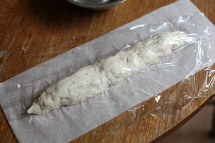After I posted yesterday, I put the bread back in and baked it 20 more minutes until it was super crusty. Then I sliced it lengthwise to get it drying from the inside out. My child ate it w/a lot of salt on top. Encouraged, I put the opened loaves back in the cooling oven for 10 minutes to dry them out. He really likes them at this point with ALOT of salt (3 weeks into his wheat-free life he’s desperate for something). So I thought I’d bake the rest of the dough as thin (1 inch or less) snakes rolled in salt, a kind of pretzel stick feel.