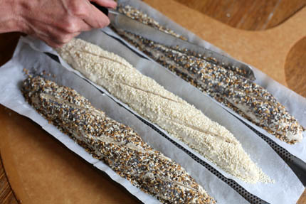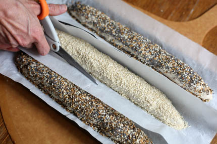 Using a sharp Serrated Bread Knife slash the baguettes at a diagonal three times 1/4-inch deep down the loaf.