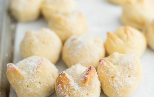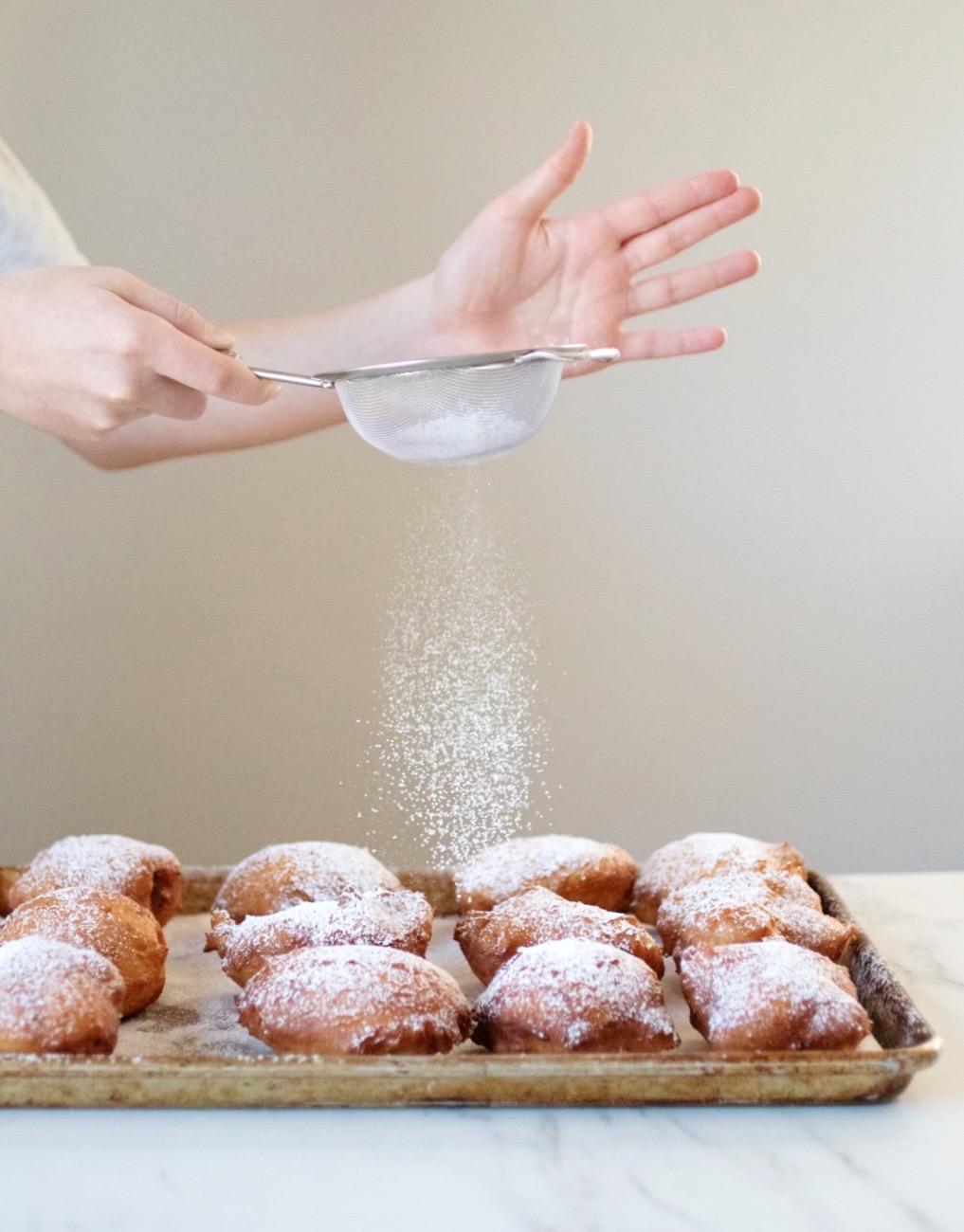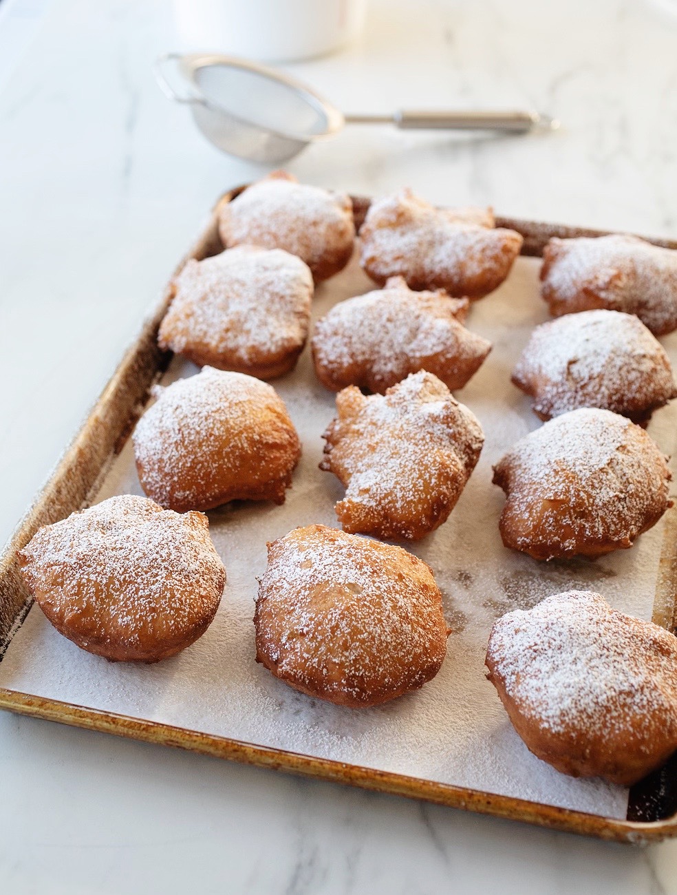 Zeppole are a traditional Italian doughnut–a Christmas treat, but the internet holds many different descriptions and definitions of what they are. Some versions are carefully piped, some are made as small doughnut holes, and some are roughly free-form. Years ago I ate the latter rendition in New York at the San Gennaro Street Festival in Little Italy, (which is held in September, so these aren’t just for Christmas) and he loved them so much he knew we needed a post about them.