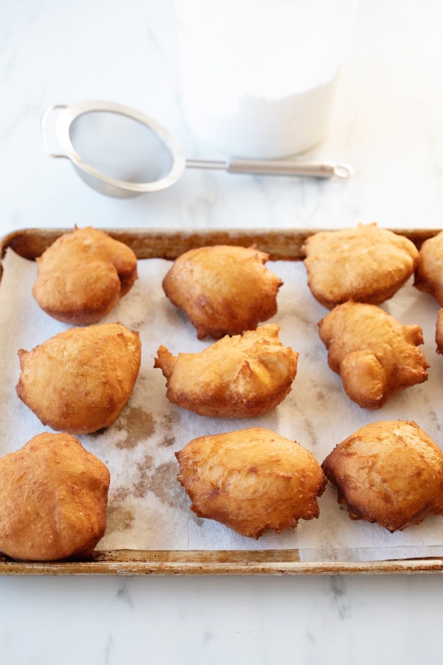 Pull out 3 oz pieces of dough (peach-sized) piece of dough, and flatten them slightly (the whole bucket of dough will make 15 to 20 zeppole, but you can do fewer pieces if desired). Place them on the prepared pan and cover with a lightly greased piece of plastic. Allow the dough to sit for at least 20 minutes (and up to one hour) while the oil heats up.