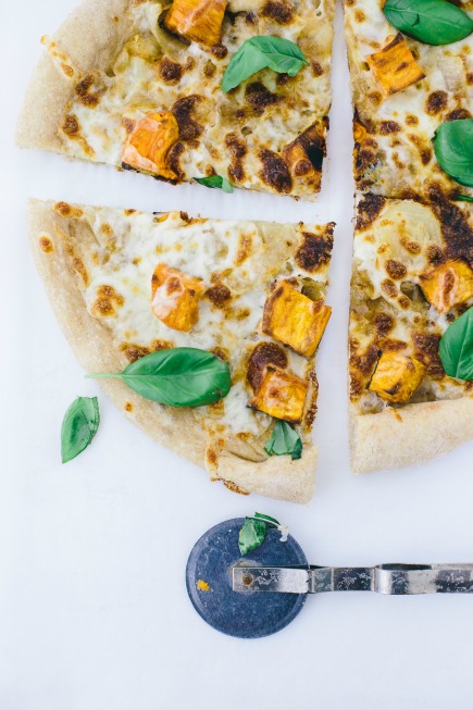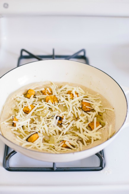 Carefully transfer the dough to the preheat pan, and quickly spread olive oil or sauce over the dough, then the cheese and whatever other toppings you are using (I’ve used olive oil, roasted sweet potatoes, caramelized onions, and mozzarella cheese here). Cover the skillet and cook for about 4 minutes without lifting the lid (unless, of course, you smell scorching).