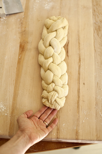 Braiding six strands takes a bit of technique, but once you have the rhythm the braid goes together quickly and easily. Keep in mind that you are only working with one strand at a time, so there is no juggling to do. You want to be sure to keep your hands and work surface well floured so the strands don’t become sticky as you work.