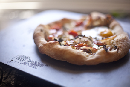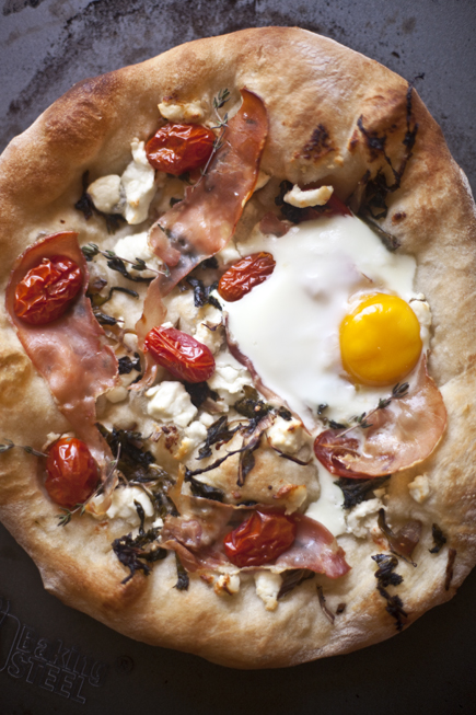 Here’s a breakfast pizza with prosciutto, cherry tomatoes, sautéed kale, soft goat cheese and fresh thyme, baked on our olive oil dough with an egg cracked on top.