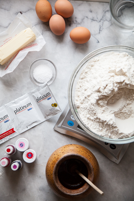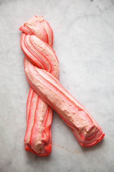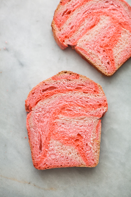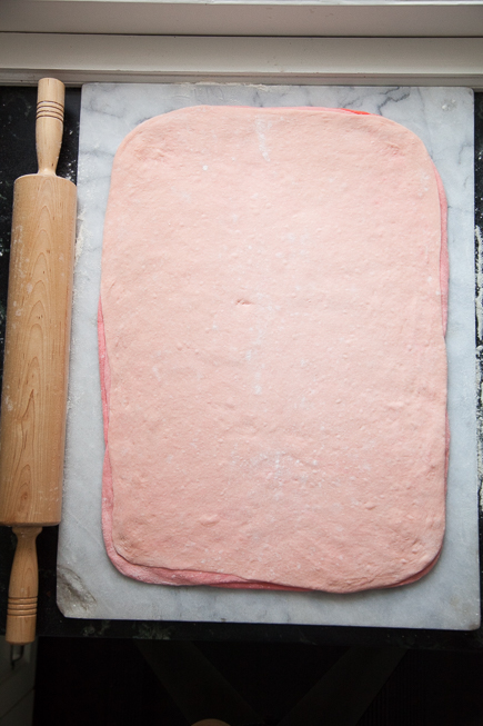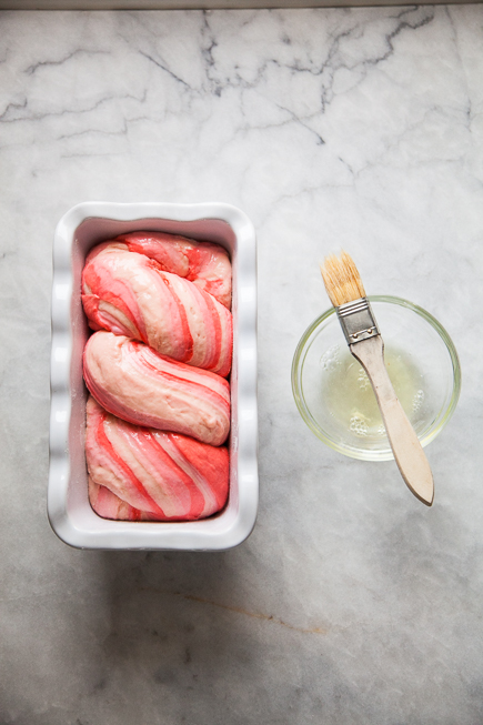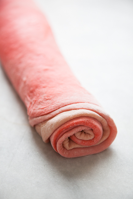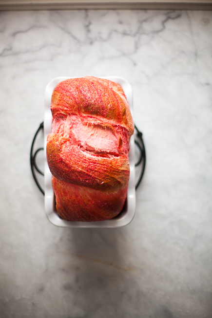 As we were prepping all the cheesecakes for my class, Victoria, the kitchen assistant extraordinaire, told me about a bread she bakes for her young daughter. Victoria helped me on my Craftsy bread class* and played with the recipe to create a rainbow of colors with it. Brilliant. I immediately thought of a Valentine’s Day Bread with swirls of pink and red.