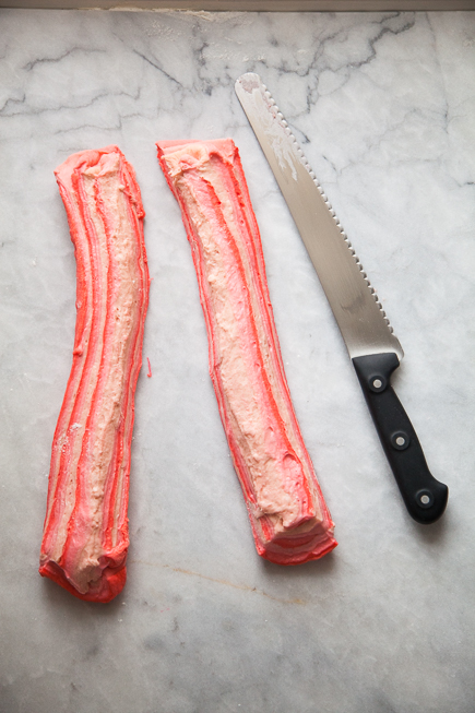 Take one of the logs and cut it lengthwise, down the middle. wrap and refrigerate the other log for another loaf.