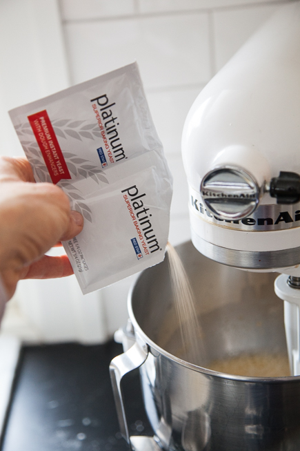 In a stand mixer, fitted with the paddle attachment, mix the water, Platinum yeast, salt, eggs, honey and butter together. Add the flour and mix on low until combined.