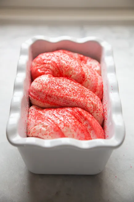 Let the loaf rest for about 90 minutes (45 if you are using non-refrigerated dough). Brush with more egg white wash and sprinkle with red sugar sprinkles.