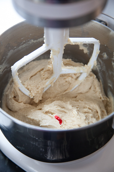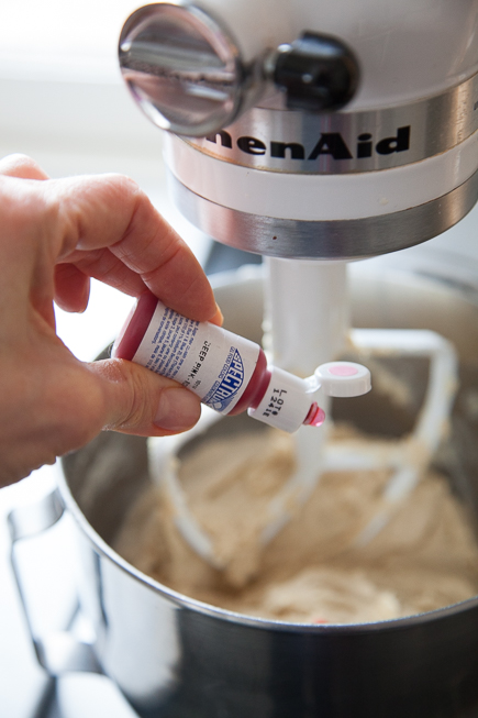 I like to use gel colors, because you get a more intense color and they are neater than the paste. But, if you have one you like to use, any will work. You are going to be adding color, then dividing the dough and adding more color, so you’ll end up with 4 bowls of dough in the end.