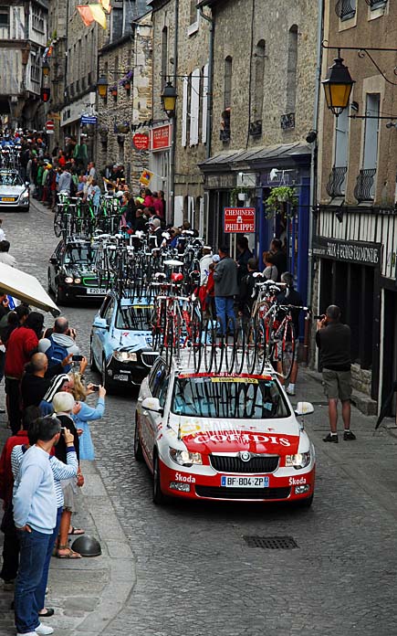 … we mainly just ate in Dinan rather than photographing. We loved it no less than Paris or Beynac. A high point was when the Tour de France actually passed by our front door. It only takes 90 seconds for the pack to pass at the beginning of a stage, and I somehow managed to miss it (I was getting a beer– this is their World Series after all). Here is the caravan of spare bicycles that trails the pack: