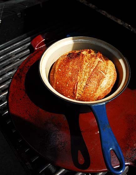 So if you like, skip the wadded-up aluminum foil, and as always, keep the pan covered for the first half to two-thirds of baking, then finish open (always with the grill lid closed). I had trouble keeping my grill at 450F today, so I went with 350F and took a longer baking time (45 min), actually turning the loaf in the pan every ten minutes once it was opened (the bottom surface created this terrific browning, even at this low temp). More on this method on our site, click here for a grill loaves in an iron pot, or click here for grill loaves in a clay cloche: