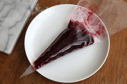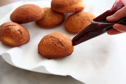 Cut a small hole in the pastry bag and fill the doughnut with the jelly. You want enough jelly so that every bite will have some, but not so much that it will be a huge mouth full of it.