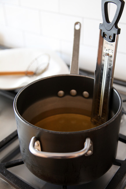 Heat about 3 inches of oil in a large pot, you want to make sure there is plenty of room above the oil. Set up a Candy Thermometer on the rim.