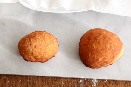 The doughnut on the LEFT was cooked without resting first. You can see that it didn’t rise as well in the oil. The one on the RIGHT is a nicer shape and the interior is light and fluffy.