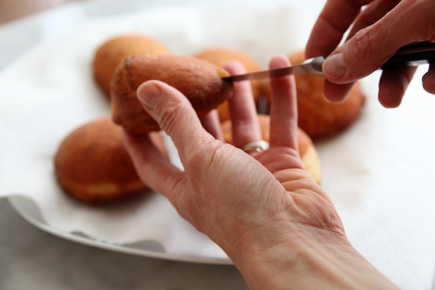 Once the doughnuts are completely cool, poke the tip of a pairing knife into one end to create a hole.