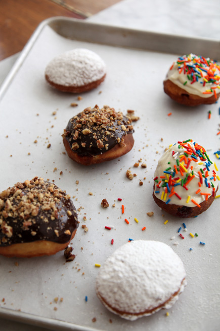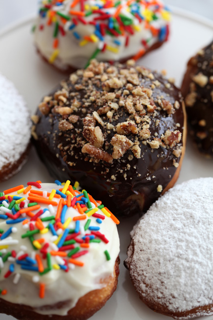 This week is Chanukah and my family revels in the amount of doughnuts (sufganiyot) we can eat. It is tradition during the holiday to eat fried food, lots of it, which is something I easily embrace. We start with lacy potato latkes and end the meal with jelly doughnuts. This year I filled the doughnuts with many types of jam, jelly and preserves, each had a different topping to go with it. Each one became my new favorite. With a bucket of brioche dough from ABin5 and some oil you are ready to make doughnuts that are better than the bakery down the street.
